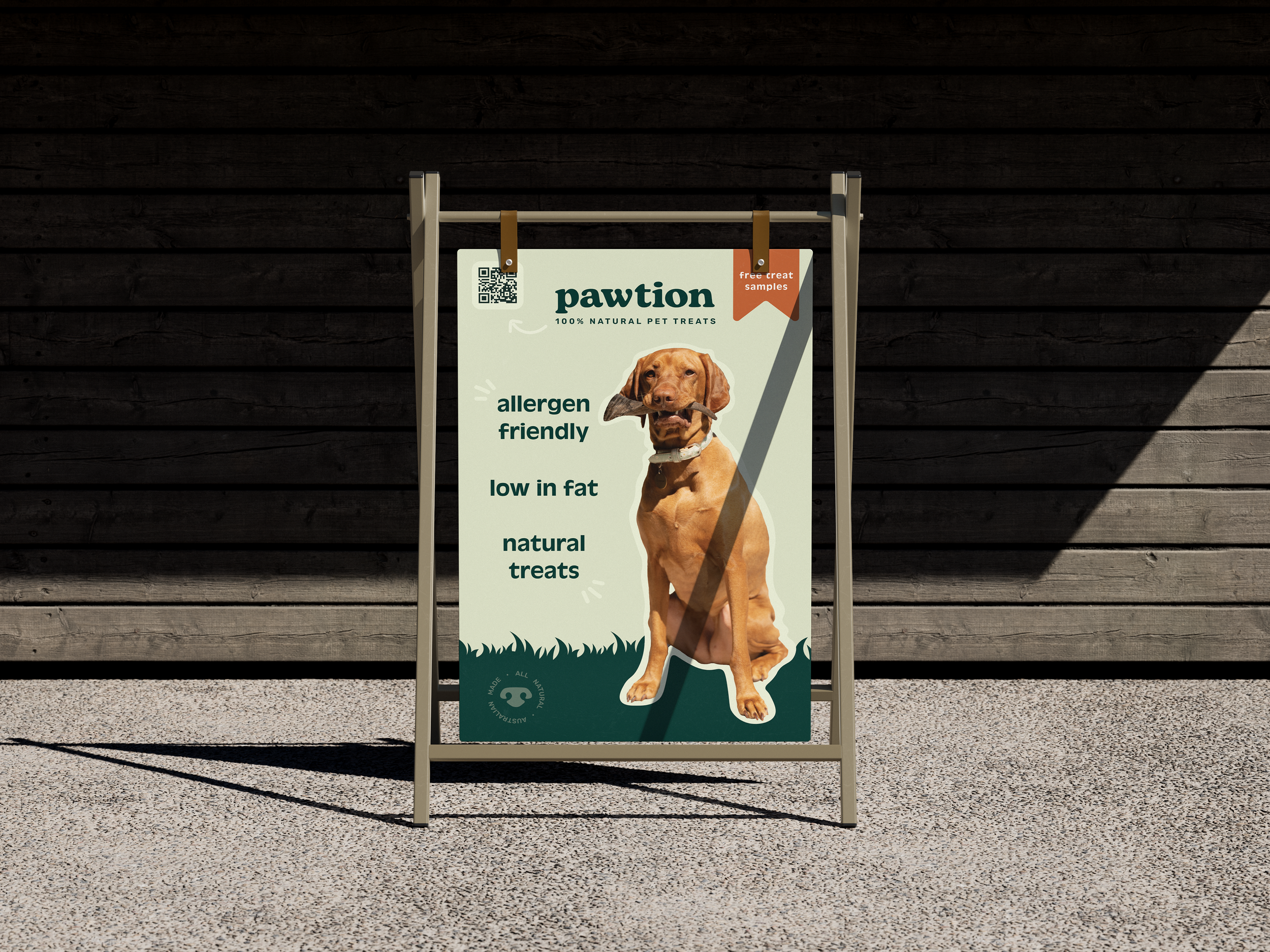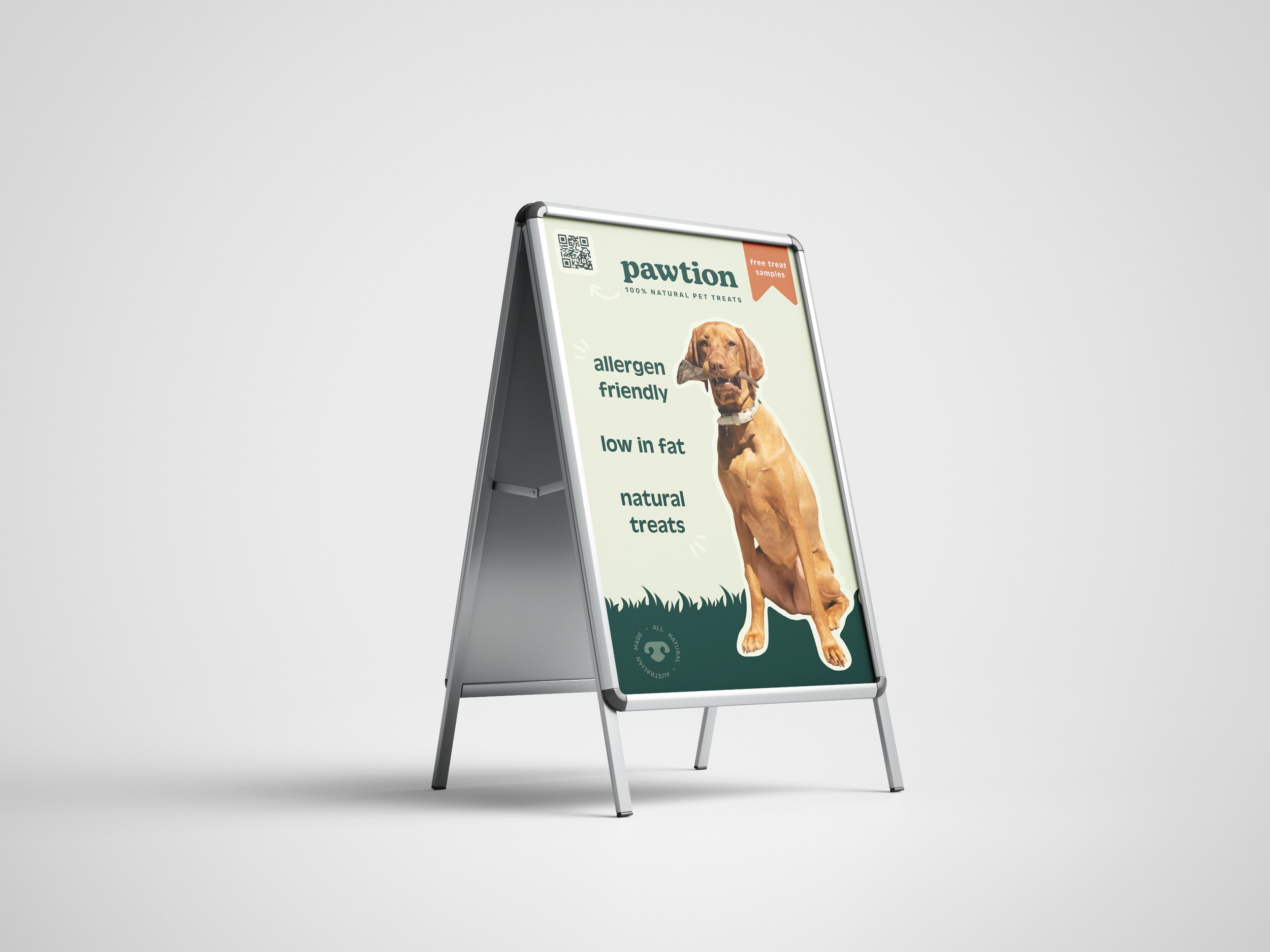 A-Frames are a fantastic way to draw attention to a retailer in open spaces. Used in the walkways of various markets throughout Sydney, this a-frame provided a clear way-finding asset for customers to locate the Pawtion market stall. It was also used as a call to action for new customers, inviting them to the retail stall for free treats to test their products and to the website if they weren’t familiar with the brand.